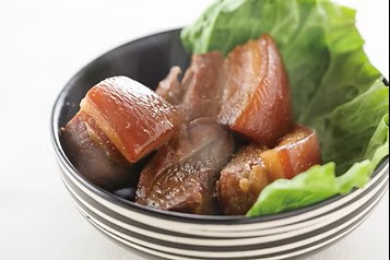 2. 煮好的豬肉瀝乾,用水輕輕沖洗後,加入鰹魚汁、黒糖、醬油、酒,以中火燉煮。