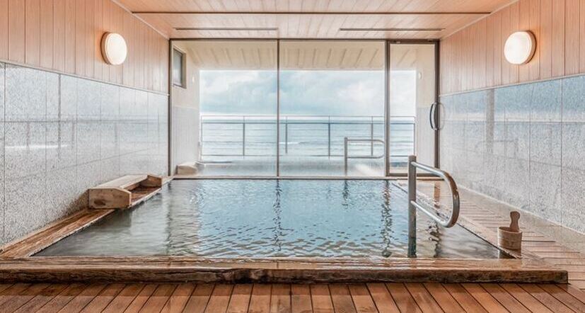 自發湧泉「東屋」 在本舖玄關前的東屋,可以看見天然溫泉湧出的景像。自成立以來,此處的湧泉十分古老且充沛, 57.6°C的透明泉水,是本舖天然的溫泉湧泉處。 一邊欣賞津輕海峽和下北半島的美景,一邊在大理石的露天浴池中享受夏天的海風, 或是冬天的雪景。