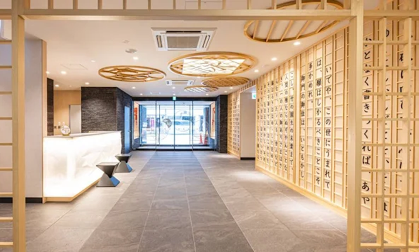 將發祥於京都之地的吉田兼好之作徒然草及百人一首等詩詞裝潢於大廳,展現京都傳統與時尚並存的氛圍