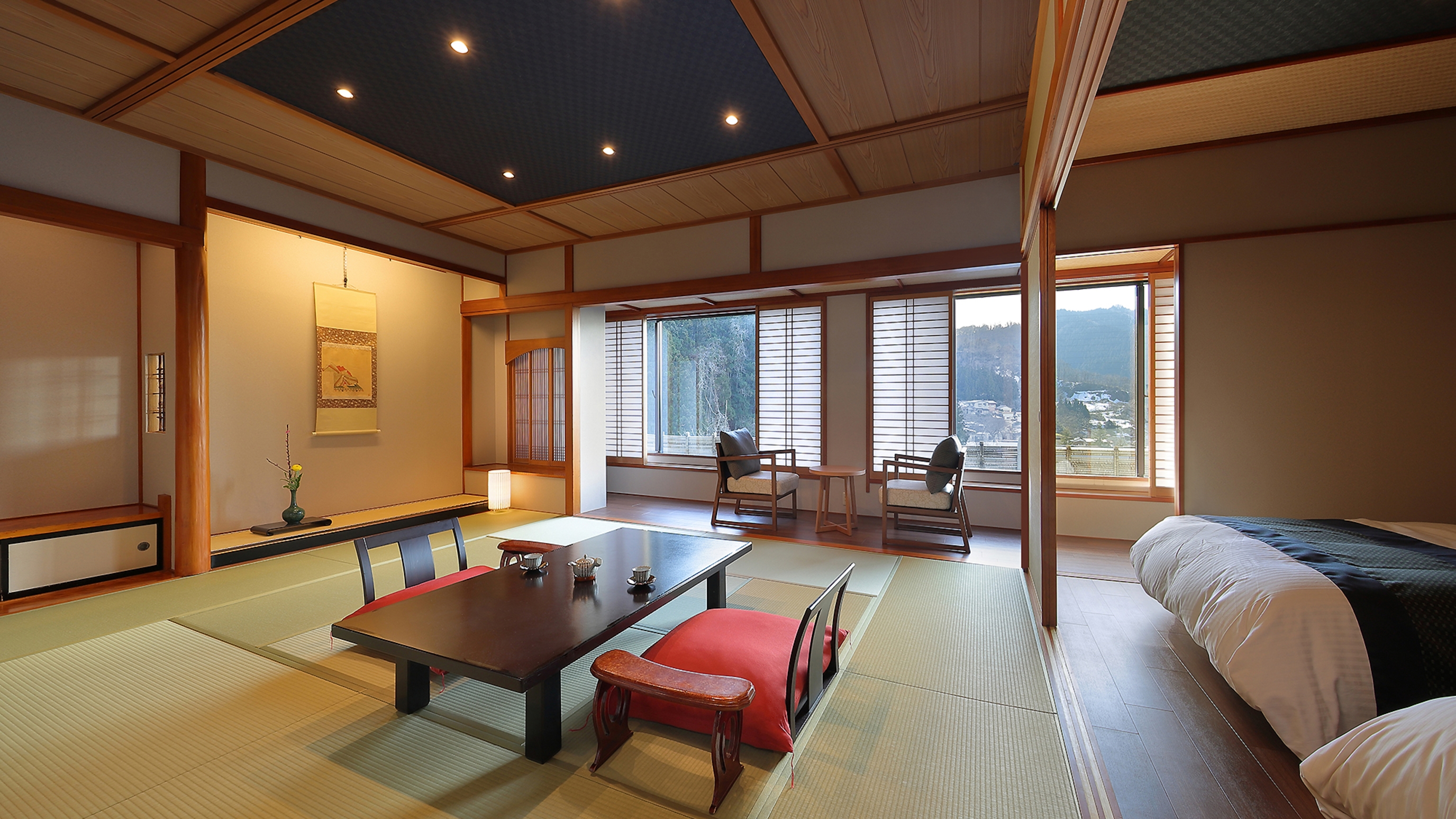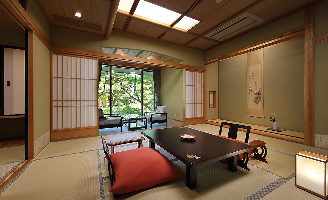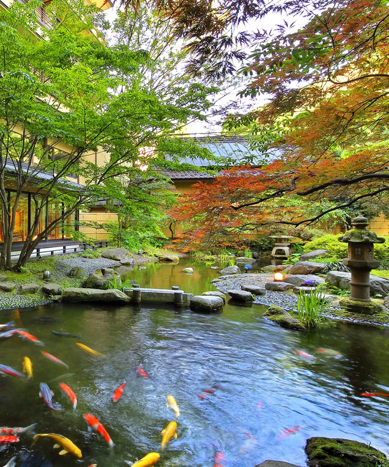 可眺望綠意盎然的日本庭園,黃昏時分燈影倒映水面,景致夢幻迷人。