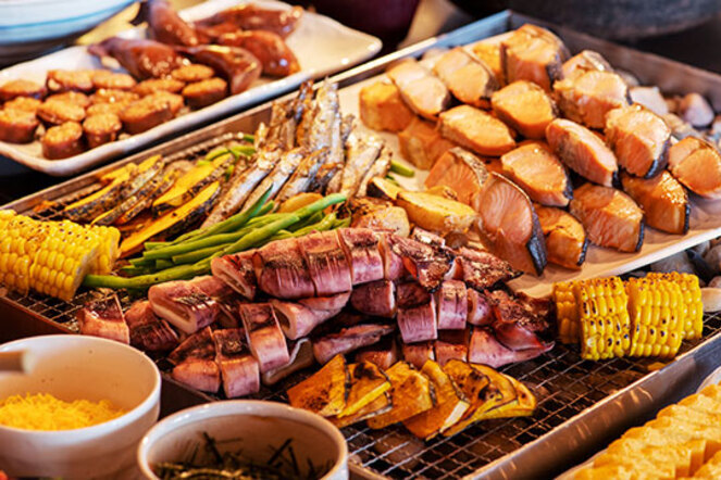 包含鮭魚卵、甜蝦刺身,以及烤物等豐富的海味,讓您在和風的自助餐廳中盡情享用。