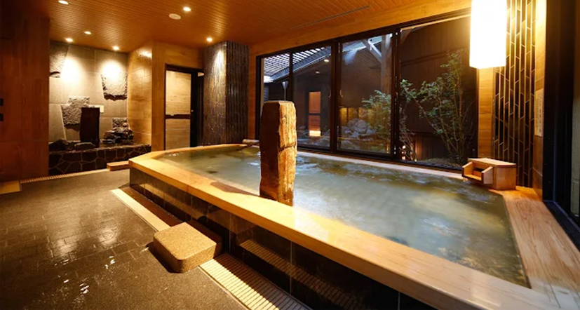 大浴場以吉野櫻為靈感設計,在暖色燈光與檜木浴槽中映照花瓣圖樣,營造春日般的療癒氛圍