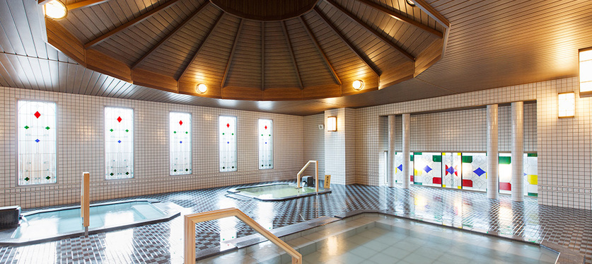 簡潔的內裝設計與色彩分明的壺風呂,構成了寬廣而明亮的大浴場,