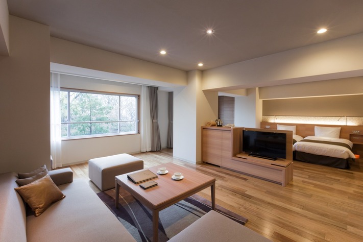 客房整體的色澤彩度較低,配合充分的採光與簡潔的家具選擇,提供洗鍊的現代化居住體驗。