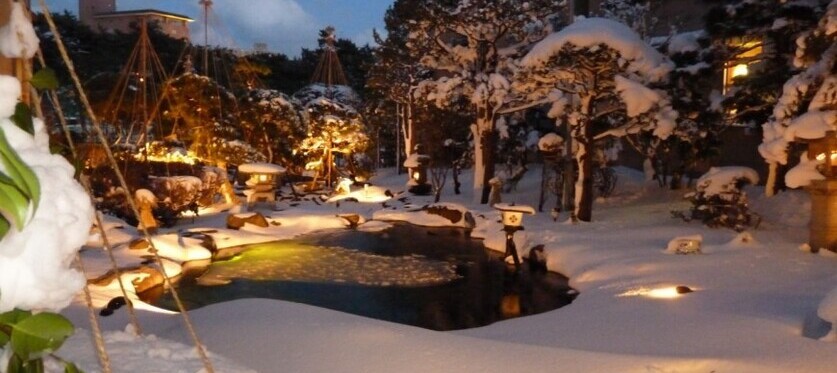 七十年前由京都的職人所建成,特地選在旅館的中央,讓所有的客房都能一望精心設計的庭園,四季移轉之際的景色充分展現不同的面貌。