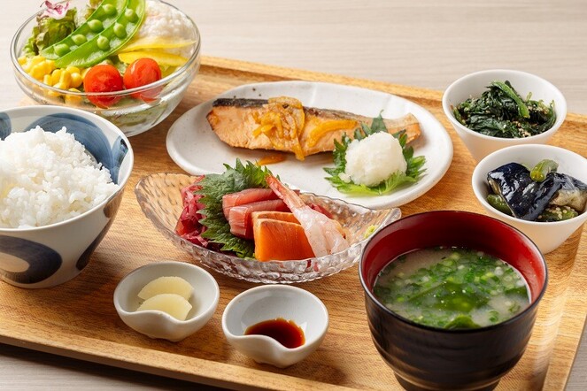 我們提供日本北海道製造的菜餚,納豆、山藥、牛奶、米、新鮮蔬菜等。