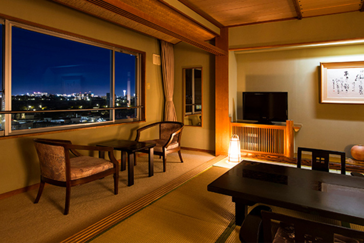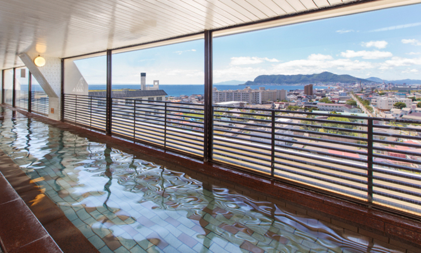 俯瞰函館市景的頂樓大浴場,透過30公尺長的大面落地窗,您可以一邊泡在溫泉中,一邊欣賞美麗的夜景與鮮明的山稜線。