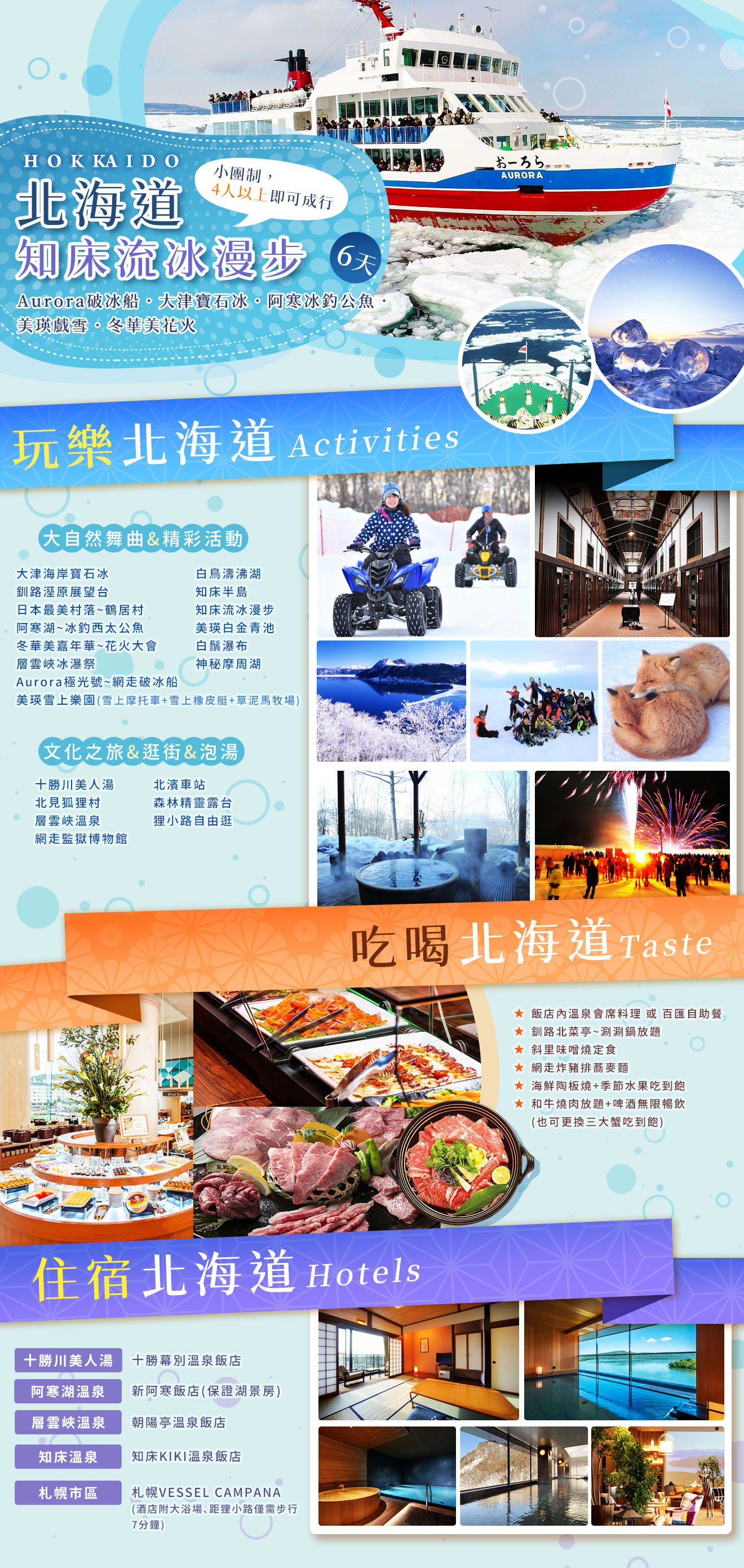 【知床流冰漫步】Aurora破冰船.大津寶石冰.阿寒冰釣公魚.美瑛戲雪.冬華美花火6天