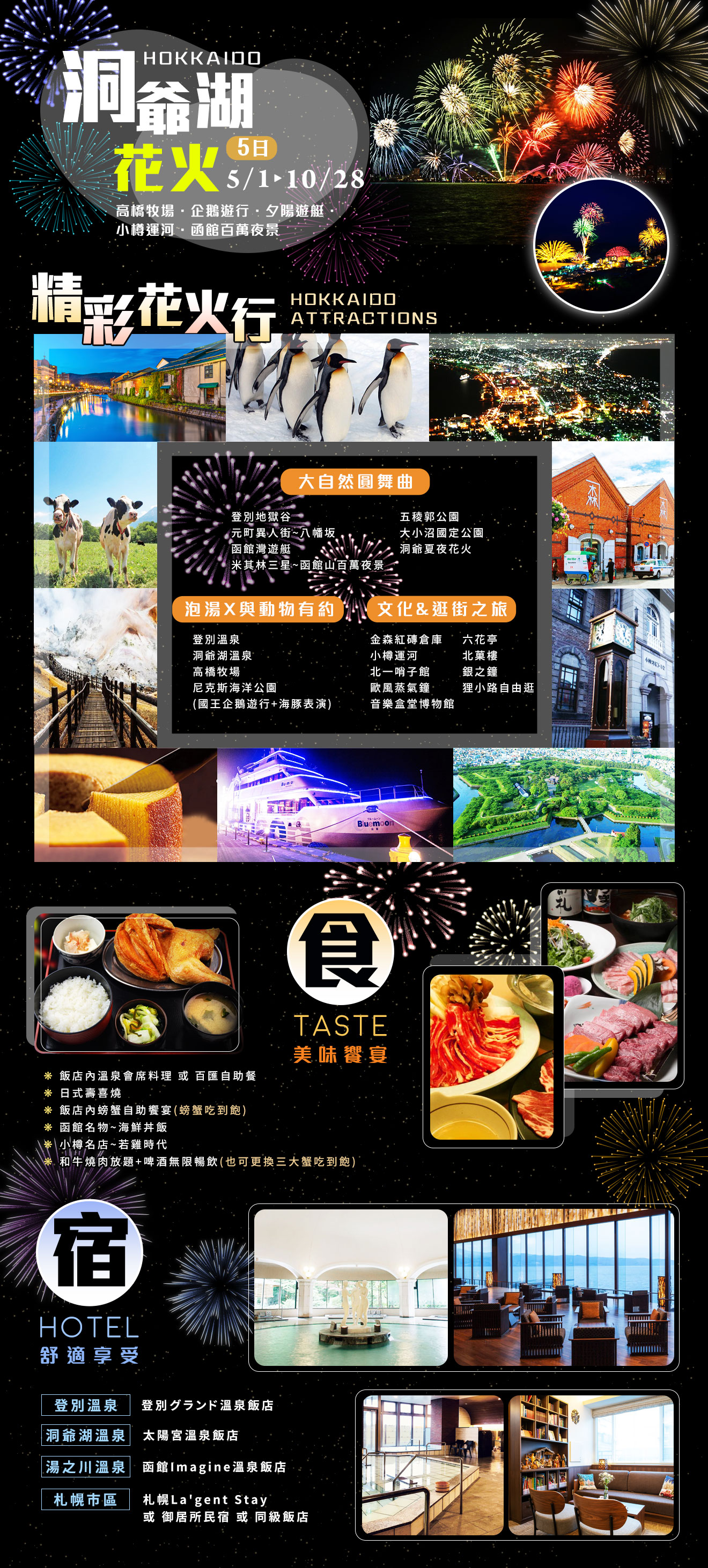 TOUR - 【洞爺湖花火】星型五稜郭.企鵝遊行.小樽運河.夕陽遊艇.函館百萬夜景5天