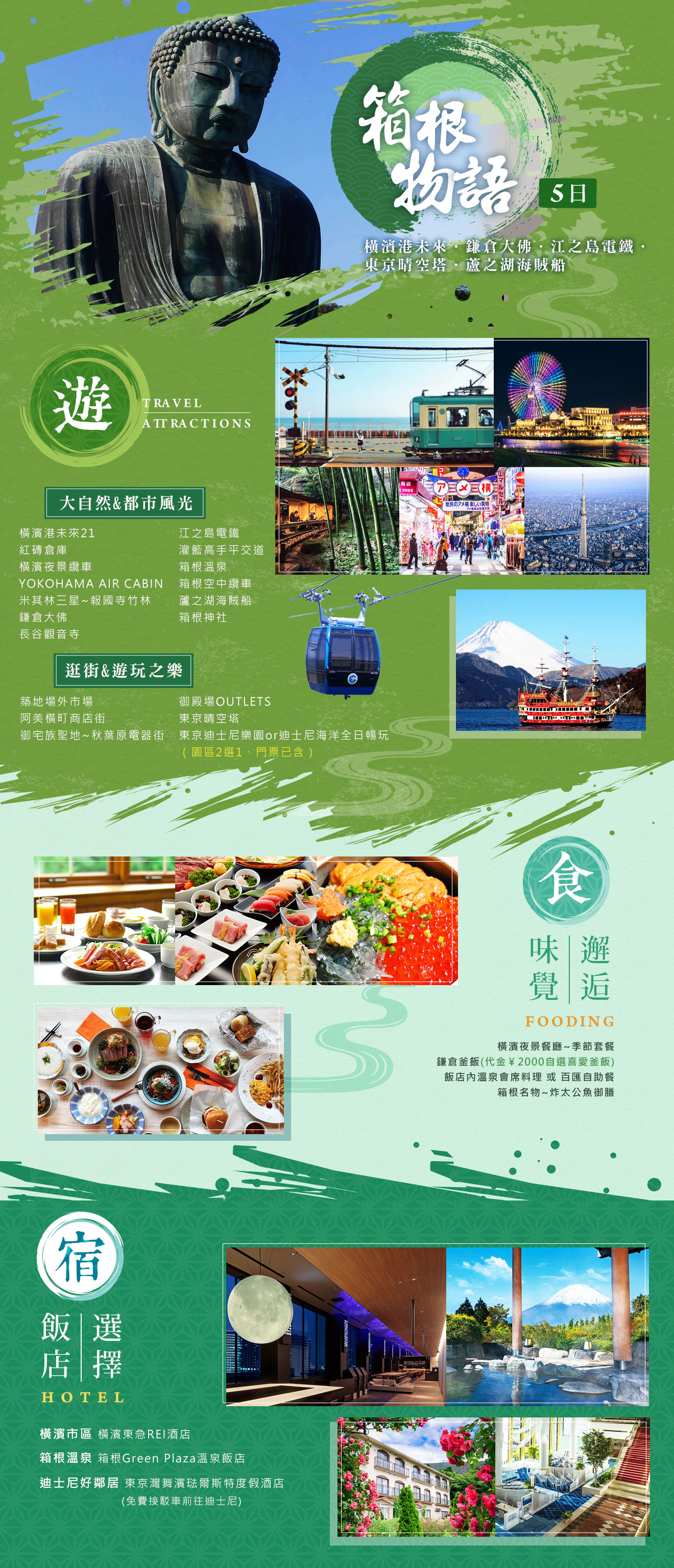 宿 箱根溫泉:箱根Green Plaza溫泉飯店團費已含有料地:報國寺休耕庵、鎌倉大佛、長谷觀音寺、江之島電鐵(長谷~鎌倉高校前)