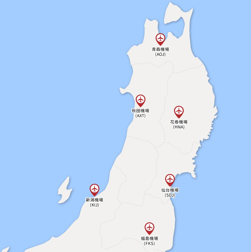 東北地區以 仙台機場/青森機場/花卷機場/秋田機場/福島機場/新潟機場有提供國際線航班,其他機場為提供國內線航班。